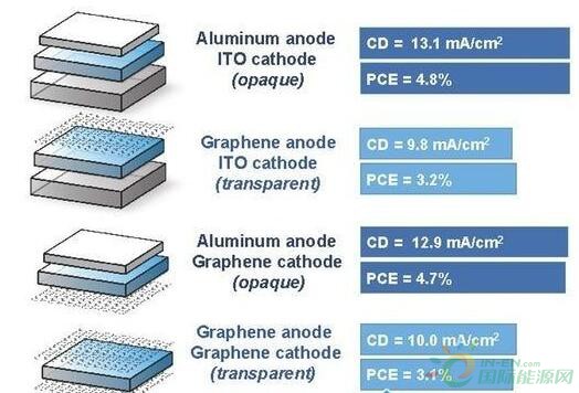 该团队将石墨烯电极太阳能电池与其他由标准材料制成的太阳能电池进行比较,石墨烯太阳能电池的功率转换效率(PCE)为4.1%,远高于常规太阳能电池板和此前的透明太阳能电池。