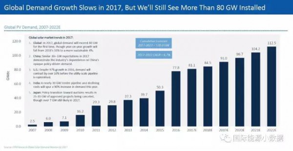 根据GTM Research咨询公司最新评估,2017年全球光伏增速放缓,与2016年相比增长仅为4%(2016年比上一年增长55%),新增装机将达到81吉瓦(其中中国新增装机超过30吉瓦)。