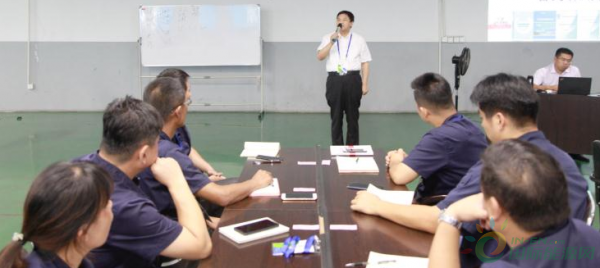 大海新能源培训教室举行第七期精益生产管理培训活动,集团公司党委书记、董事长刘福海,集团公司副总经理,各实体单位有关负责人,大海新能源部分班组员工参加了培训。