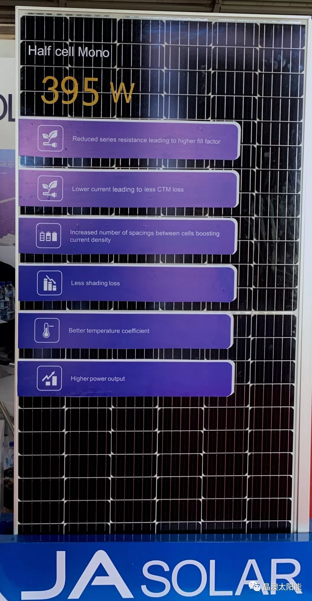 晶澳太阳能为三个展会精选了多款高效组件,满足市场多样化的需求,包括单晶PERC双面双玻组件(JAM72D09-390/BP)、单晶PERC半片组件(JAM72S10-395/PR)、5BB单晶PERC组件(JAM72S09-390/PR)、5BB多晶组件(JAP72S09-350/SC)等。