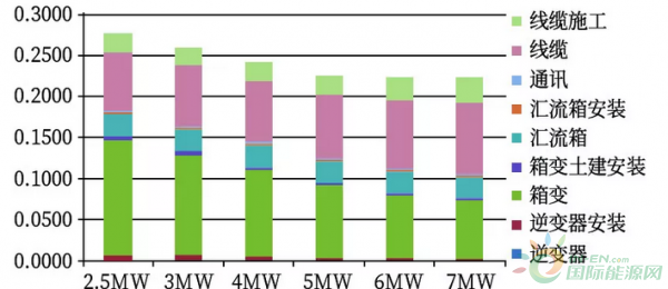 在中国光伏行业发展的过程中,子阵容量历经了1MW、1.25MW、1.6MW、2.5MW、3.125MW由小到大的演变,经过精细化的方阵容量设计对比发现,光伏子阵容量增大后,电站逆变器、变压器等设备数量减少,安装维护成本降低,站内高压线路减少,线缆和施工成本降低。经测算,对于1000V系统,子阵容量按照3MW设计,系统成本最优;对于1500V系统,子阵容量按照6~7MW设计,系统成本最优。目前海外欧洲、东南亚等实际电站中基本按照该原则设计,值得一提的是,印度光伏电站虽然起步较晚,但在系统应用技术上已经十分超前,不仅全部切换到1500V,单个子阵容量最大已经达到12.5MW。