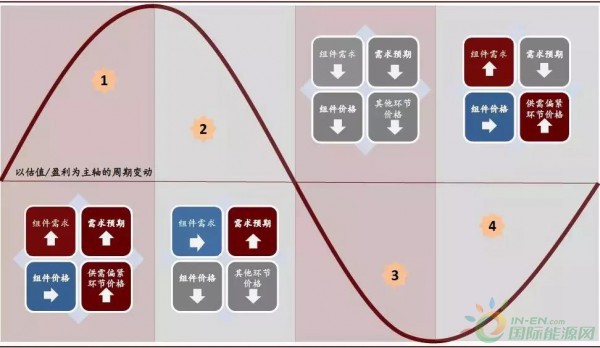 根据光伏价格和需求的联动,其周期变动可分为4个象限:需求增长带动价格增长;需求增速放缓价格平稳;需求增速不及产能增长价格下跌;需求回升带来价格平稳。中金认为,价格进入平台期往往是周期起点的信号,而市场预期悲观和此前的价格下跌让行业的盈利和估值均进行了大幅调整,使得行业具备抄底的基础。