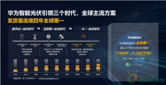 3月31日,华为发布的2019年度报告,根据2019年权威机构IHS Markit报告,华为智能光伏发货量连续四年全球第一,截止2019年底全球发货量超118GW(1.18亿千瓦)。