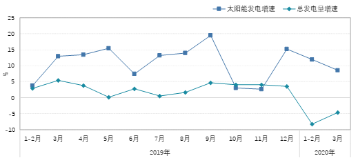 从2019年太阳能发电增速分月走势情况来看,太阳能发电量保持平稳增长,2020年1月份以来,尽管受新冠肺炎疫情影响,导致全社会用电量整体大幅度下滑,电力需求骤然放缓,但太阳能发电的消纳仍然保持较高的水平。
