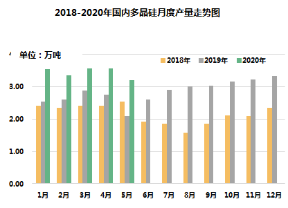 截止 2020 年 5月底,国内在产多晶硅企业 11家,其中包括检修降负荷运行企业 6家,其余均维持正常满负荷运行。5 月份国内多晶硅产量 3.21万吨,环比减少10.3%。6月份国内同步检修或设备维护的万吨级企业将有5家以上,包括东方希望、新疆大全、新特能源、四川永祥、内蒙古东立等。预计6月份国内产量将与5月份基本持平,或微幅增长;同时,海外检修企业包括德国瓦克和马来西亚OCI,进口量将继续减少。