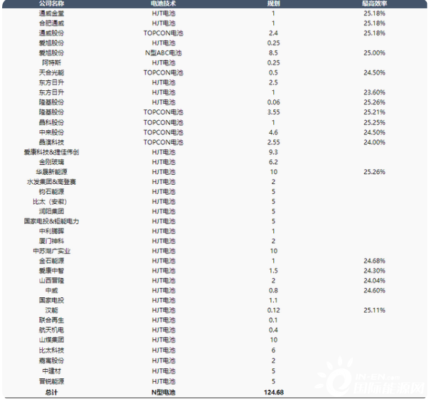 2021年,得益于电池龙头企业的带动、装备及材料的国产化进程加速、工艺技术水平提升等因素,TOPCON电池和HJT电池产业化效率稳步提升,成本不断下降,性价比进一步凸显,商业化进程开始提速,光伏企业纷纷下场布局N型电池技术,N型电池技术的发电效率也屡创新高。截止目前,据隆众资讯不完全统计,N型电池技术规划累计年产能已经达到124.68GW。