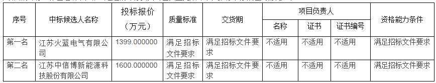 评标情况:本项目于2021年12月10日,在北京市丰台区西三环南路14号首科大厦A座16层东侧第八会议室进行了评标,共有江苏威尔五金股份有限公司、镇江市飞航电气有限公司、江苏中信博新能源科技股份有限公司、天津万隆金属制品有限公司、江苏燕山光伏设备有限公司、江苏火蓝电气有限公司6家投标人按招标文件要求递交了投标文件。经过综合评价,评标委员会一致推荐本次招标的中标候选人为:第一名江苏火蓝电气有限公司;第二名江苏中信博新能源科技股份有限公司。