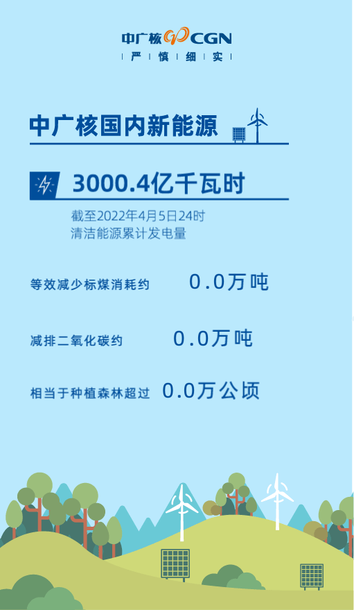 截至2022年4月5日24时,中广核国内风电、太阳能等清洁电力累计上网电量(自2007年12月26日始)达到3000.4亿千瓦时。与相同规模的火电厂相比,相当于等效替代标煤约9076.2万吨,减排二氧化碳约24071.9万吨,相当于植树造林超过67.5万公顷。