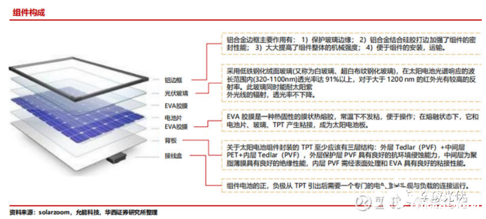 光伏组件作为太阳能发电过程中的最重要一环,是可以单独提供直流输电输出的最小单元。具有内部联接及封装的、能单独提供直流电输出的最小不可分割的太阳电池组合装置称为太阳电池组件。光伏组件作为光伏系统中最为基础的组成部分,其质量严重影响到光伏系统的工作年限。只有封装可靠,才能使电池受到更少的外界影响,体现其自身价值。太阳能组件主要有电池片、互联条、汇流条、钢化玻璃、EVA、背板、铝合金、硅胶、接线盒这九大核心组成部分。