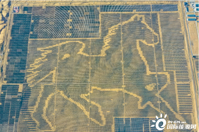 “骏马电站”充分利用与周围低矮植被、黄沙间的色差,由19.6万余块光伏板组成一匹奔腾的骏马,寓意“吃苦耐劳、一往无前、不达目的绝不罢休”的“蒙古马精神”。“骏马电站”不仅是国内最大的沙漠光伏电站,还经吉尼斯世界纪录认证为世界上最大的光伏板图形电站。