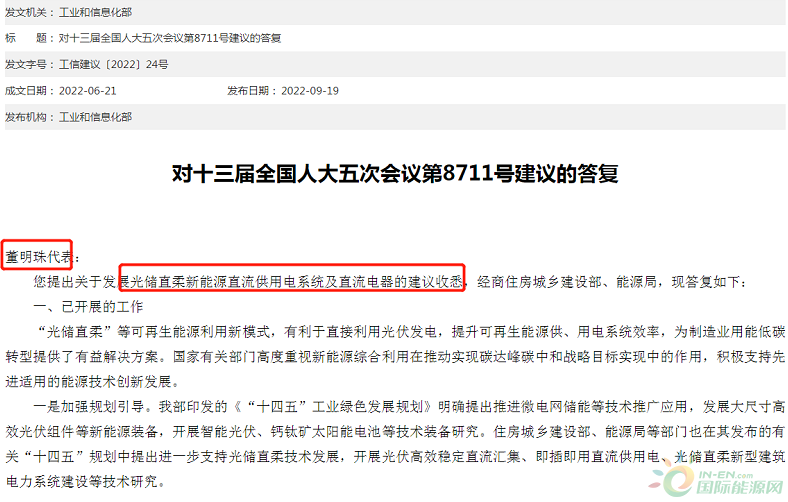 日前,工信部网站发布《对十三届全国人大五次会议第8711号建议的答复》,回复董明珠关于发展光储直柔新能源直流供用电系统及直流电器的建议。