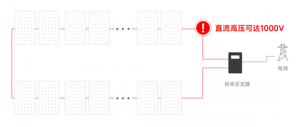 在传统光伏系统中,太阳能组件通常以串列方式进行排列,整串线路电压累计一般可以达到600V~1000V。在长年累月的运行中,线缆破损、接头松脱等问题都有可能造成直流电弧现象、击穿空气,引发火灾。不仅如此,光伏电站起火时,只要有光照就会存在电压,尤其当直流侧达到600V~1000V以上的高压时,危险不言而喻,消防队员无法开展救火工作,否则将有触电的风险。