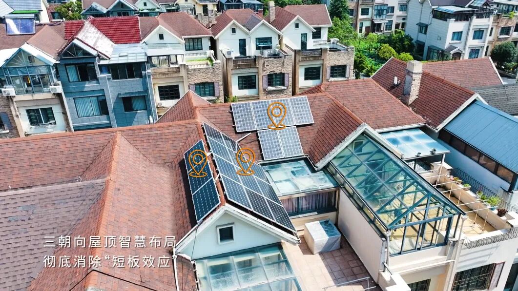 从下图中可知,许先生家的屋顶布局较为复杂,拥有多个朝向的屋面,这为光伏电站的安装带来了不小挑战。在传统光伏系统中,当一串组件分布在多个朝向屋面时,其中一面组件的发电效率降低,将会影响其他屋面的组件。而在昱能微逆YC500的加持下,凭借其组件级MPPT功能,光伏组件被分别安装在了东、西、南三个朝向的屋面上,不仅确保了每块组件的输出优化在最大功率点附近,而且还能做到组件与组件之间的发电互不影响,有效克服了屋顶朝向不佳带来的影响,实现了多朝向+多安装+多发电。