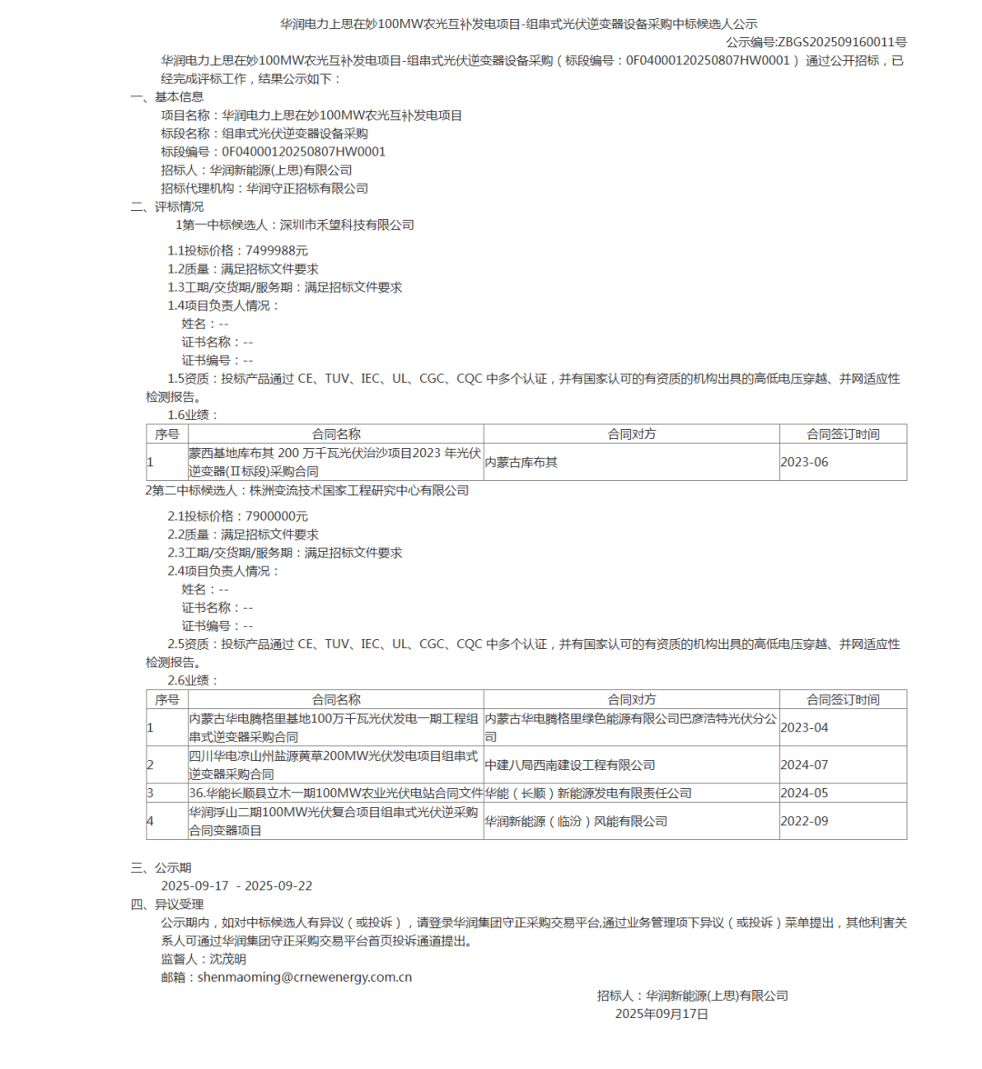 光伏头条获悉,9月17日,华润电力上思在妙100MW农光互补发电项目组串式光伏逆变器设备采购中标候选人公示。
