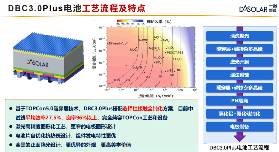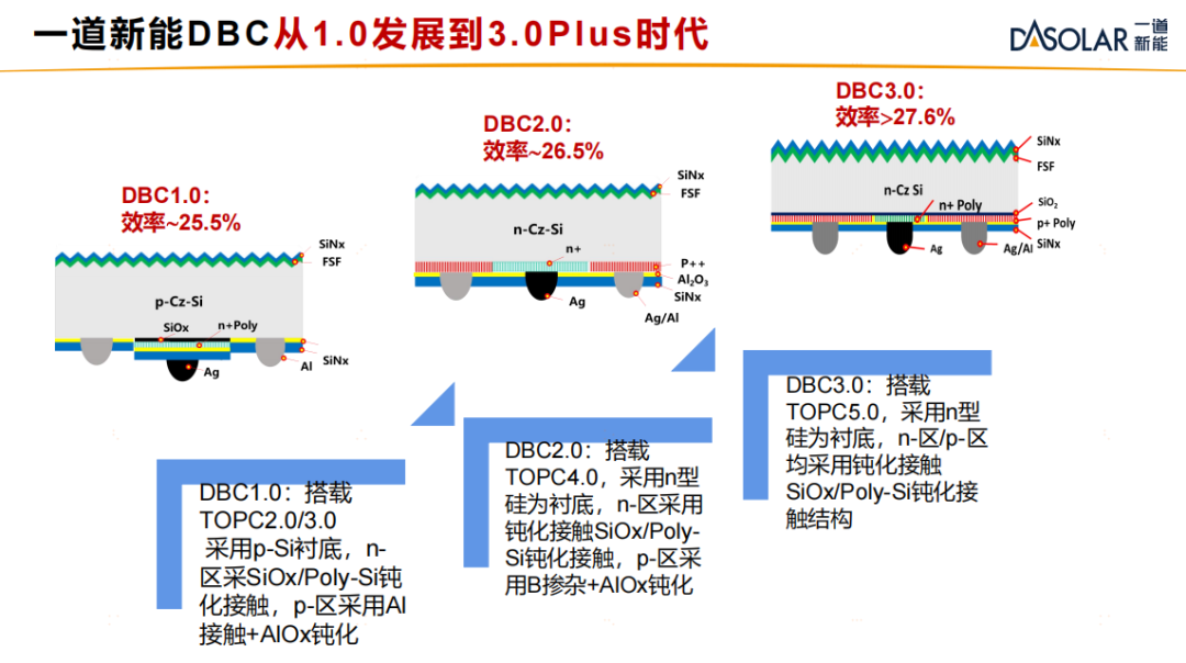 在光伏技术百花齐放多的当下,针对不同应用市场的技术多元化已成为衡量光伏企业综合实力的核心标志。BC 技术凭借其高正面转换效率与出色的外观设计,在 BIPV 等细分市场展现出巨大应用潜力。随着光伏技术与应用场景的深度融合,BC 正成为推动光伏产业向场景化和细分市场发展的新方向。一道新能依托其“一主三翼”前瞻性的战略布局、深厚的TOPCon技术积累和卓越的创新能力,通过将 TOPCon 钝化接触技术与 BC 背电极架构相结合,形成了拥有自主知识产权的DAON-BC 技术(简称DBC)。历经持续技术迭代,DBC 技术的发展路径和应用场景清晰,现已从 DBC 1.0 阶段演进到 DBC 3.0 Plus,第三方测试最高效率超过27.77%,具备引领行业发展的实力。