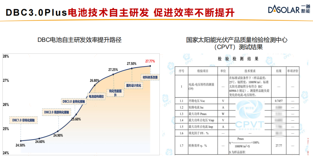 当前,一道新能已攻克多项关键技术难题,将项目研发成果转化为实际生产力。在电池效率提升方面,公司通过新材料、新原理、新工艺、新结构的创新,成功将DBC实验室转换效率提升至27.77%,达到行业领先水平,为DBC电池的大规模产业化应用奠定了坚实基础。