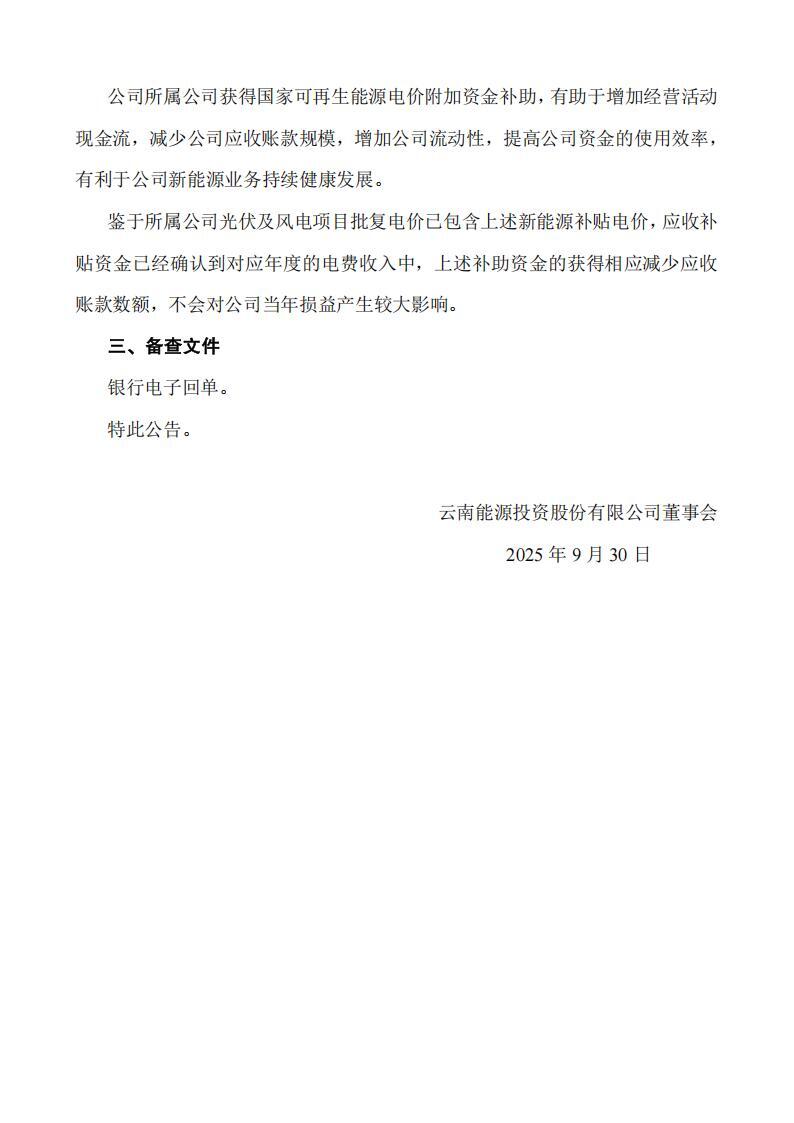 9月30日,云南能投发布关于所属公司获得国家可再生能源电价附加资金补助的自愿性信息披露公告。