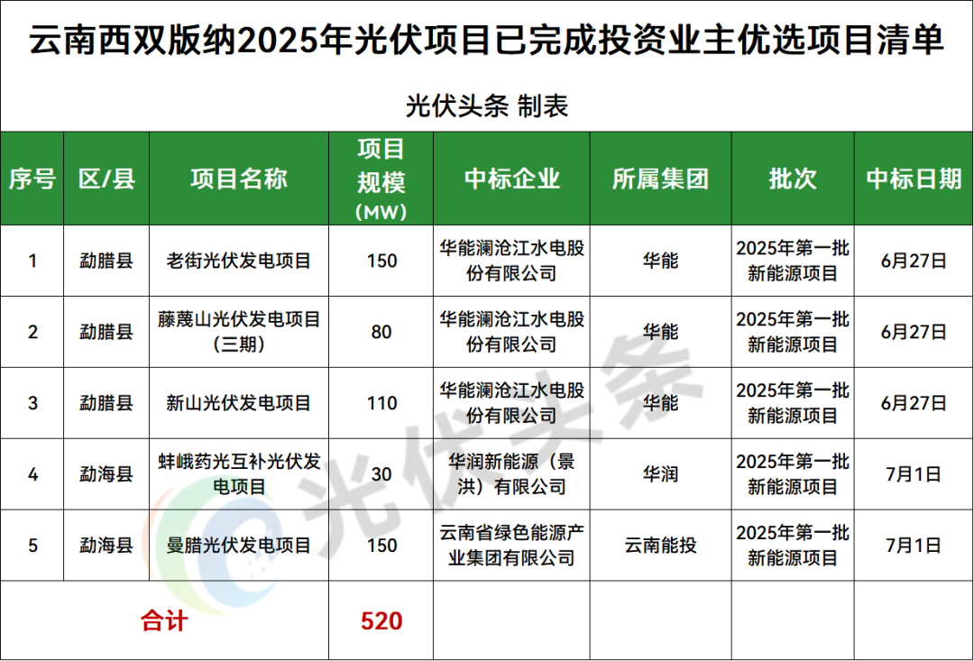 西双版纳勐腊县、勐海县2地光伏项目竞配结果公示,规模共计520MW;