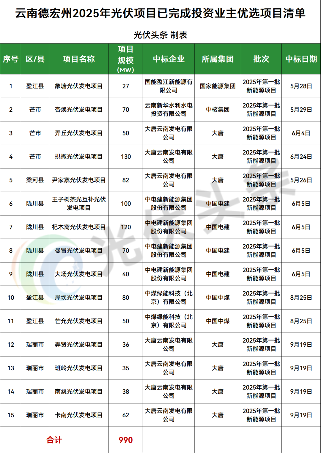 德宏州陇川县、芒市、瑞丽市、盈江县、梁河县5地光伏项目竞配结果公示,规模共计990MW;