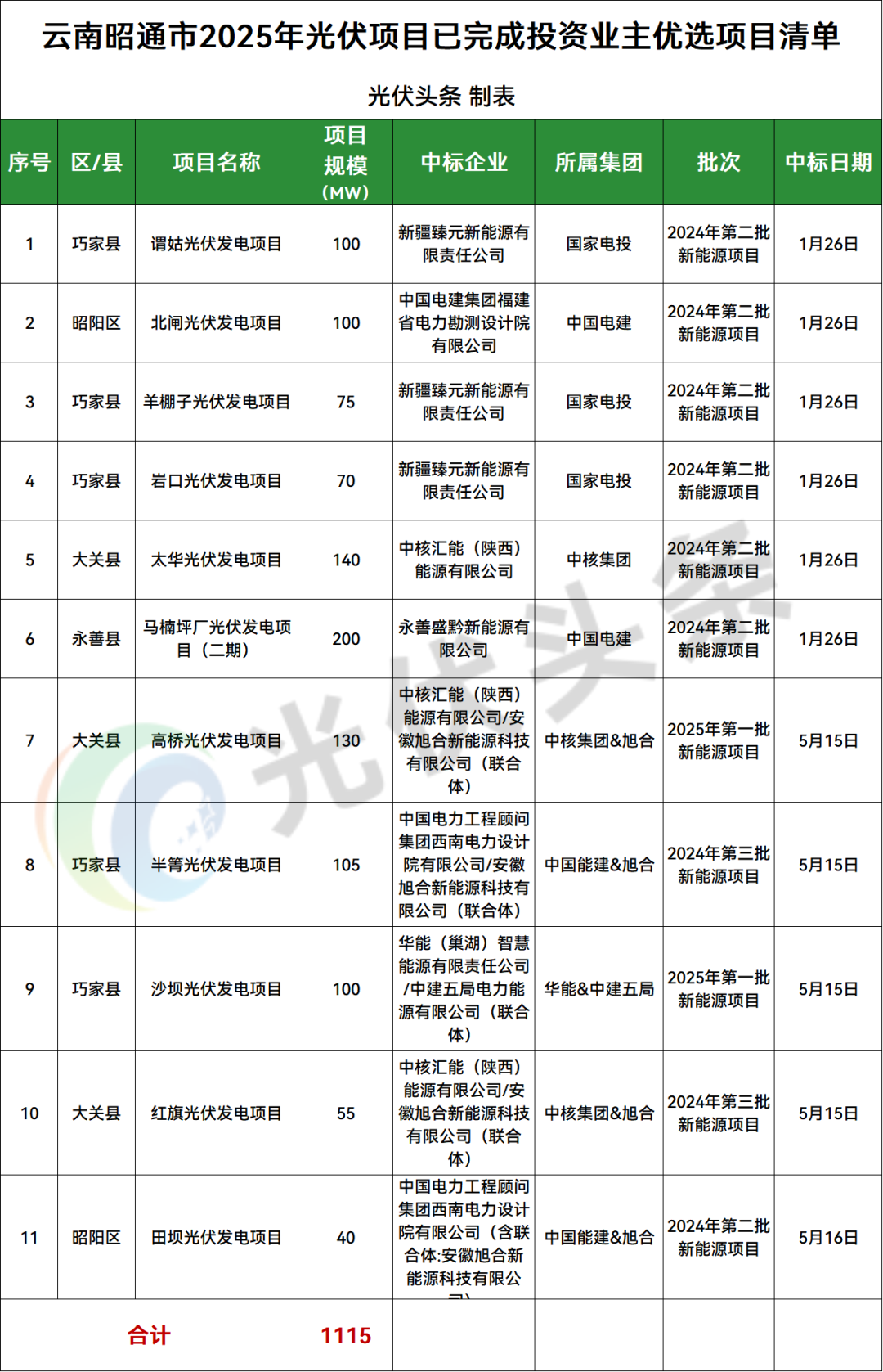 昭通市巧家县、大关县、永善县、昭阳区4地光伏项目竞配结果公示,规模共计1115MW;