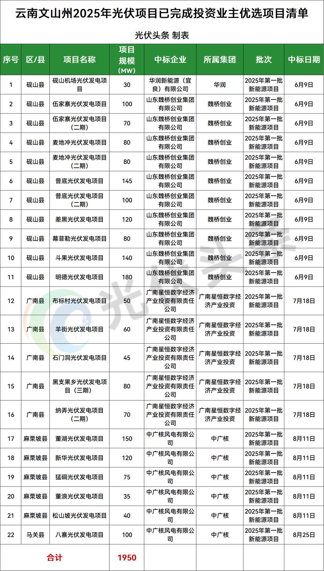 文山州砚山县、麻栗坡县、广南县、马关县4地光伏项目竞配结果公示,规模共计1950MW;