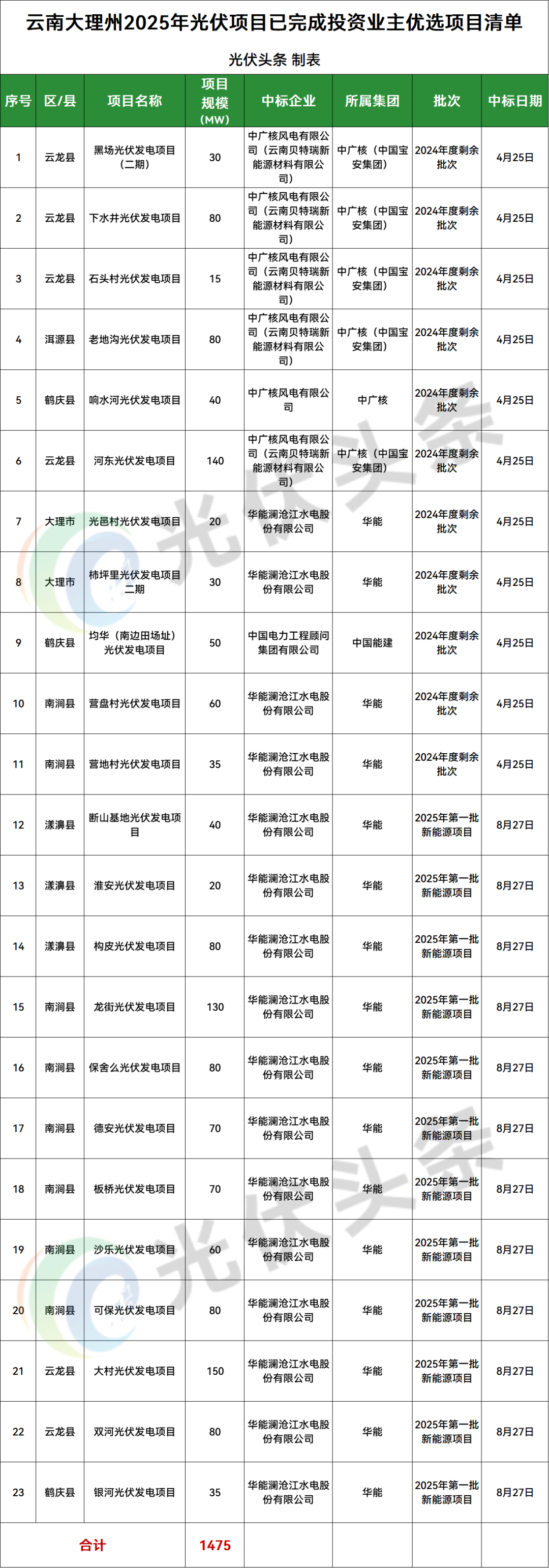 大理州南涧县、云龙县、漾濞县、鹤庆县、洱源县、大理市6地光伏项目竞配结果公示,规模共计1475MW;