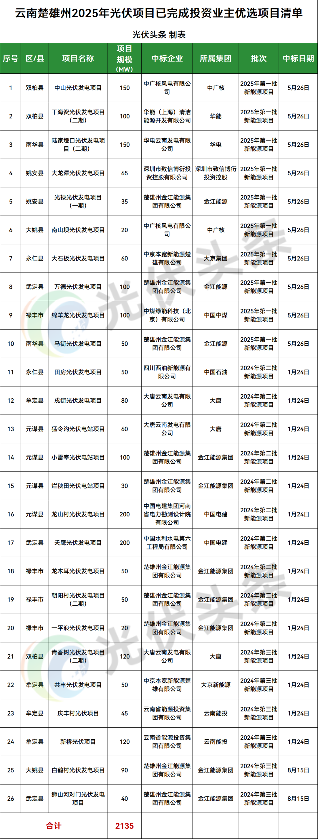 楚雄州元谋县、双柏县、武定县、牟定县、禄丰市、南华县、永仁县、大姚县、姚安县9地光伏项目竞配结果公示,规模共计2135MW;
