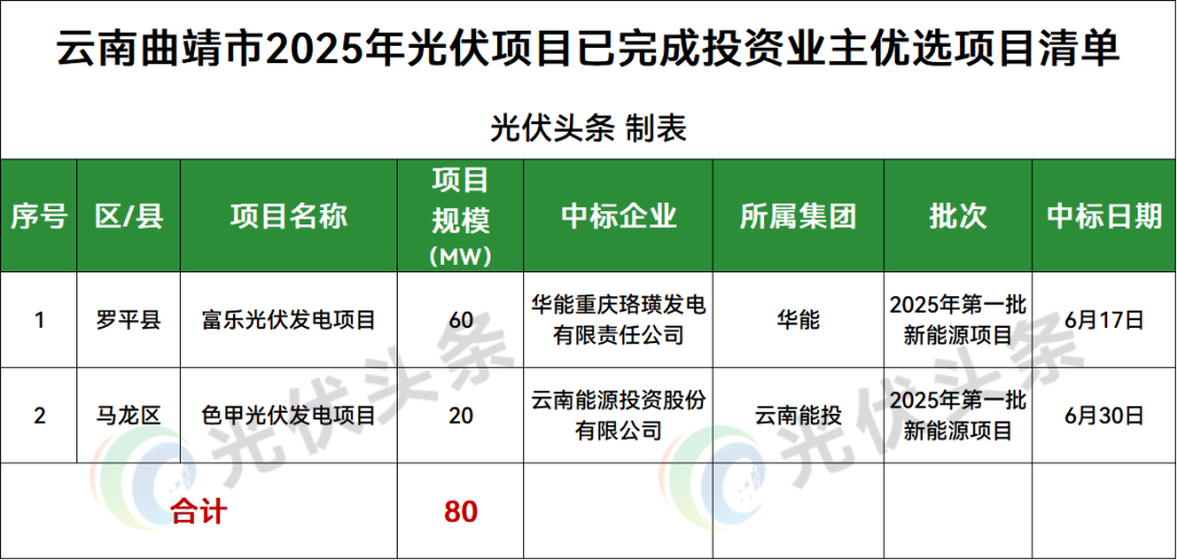 曲靖市罗平县、马龙区2地光伏项目竞配结果公示,规模80MW。
