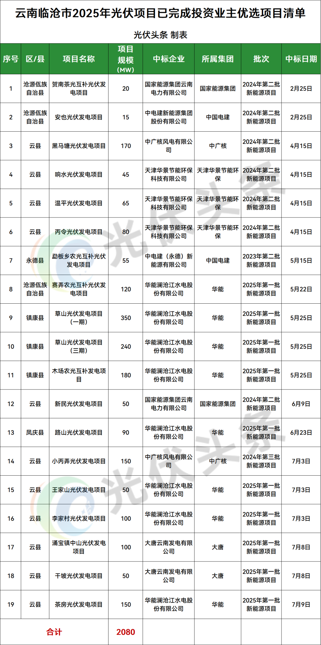 临沧市云县、镇康县、沧源佤族自治县、凤庆县、永德县5地光伏项目竞配结果公示,规模共计2080MW;