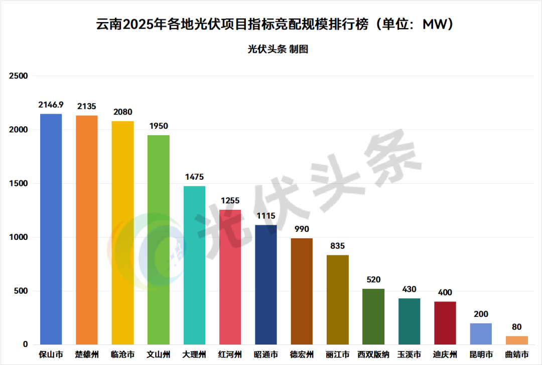 从各市/州竞配工作进展情况来看,保山市以2146.9MW位列第一,楚雄州以2135MW排名第二,临沧市以2080MW位列第三。