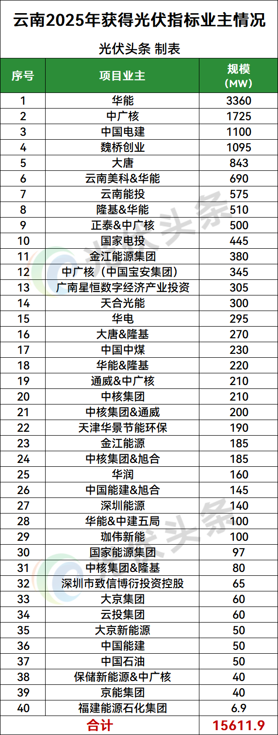 项目业主方面,华能、中广核、中国电建、魏桥创业、大唐、云南美科&华能、云南能投、隆基&华能、正泰&中广核、国家电投等40家企业或联合体获得光伏指标。