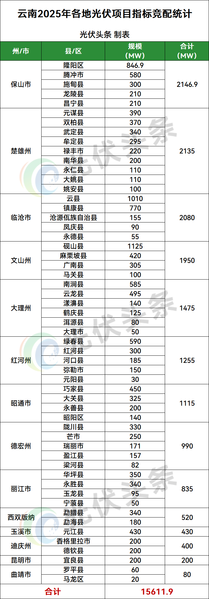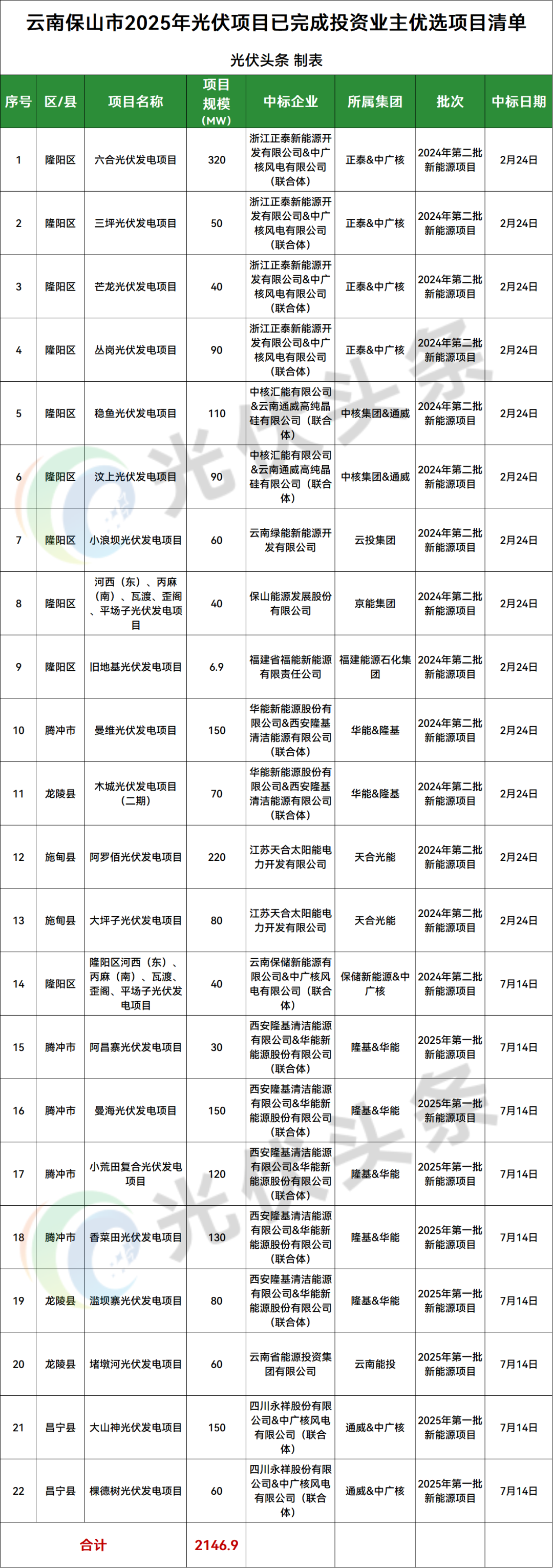 保山市隆阳区、腾冲市、施甸县、龙陵县、昌宁县5地光伏项目竞配结果公示,规模共计2146.9MW;