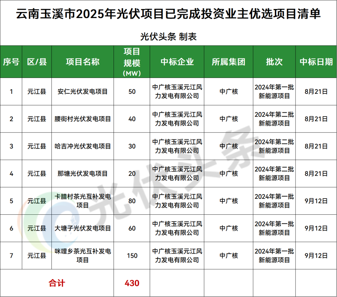 玉溪市元江县1地光伏项目竞配结果公示,规模430MW;
