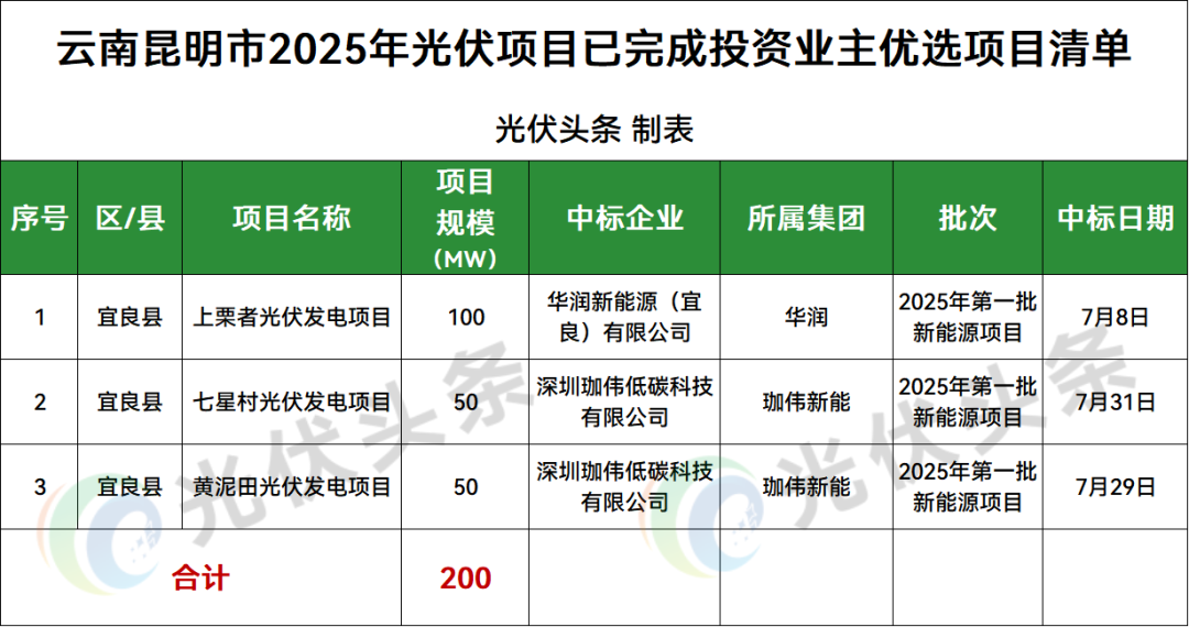 昆明市宜良县1地光伏项目竞配结果公示,规模200MW;