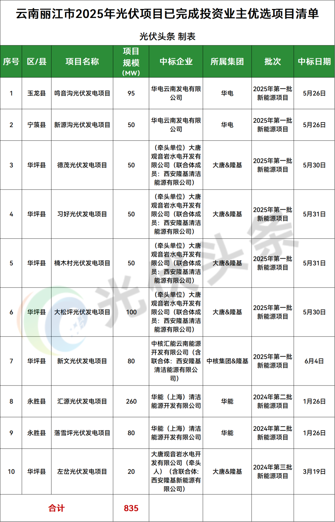 丽江市华坪县、永胜县、玉龙县、宁蒗县4地光伏项目竞配结果公示,规模共计835MW;