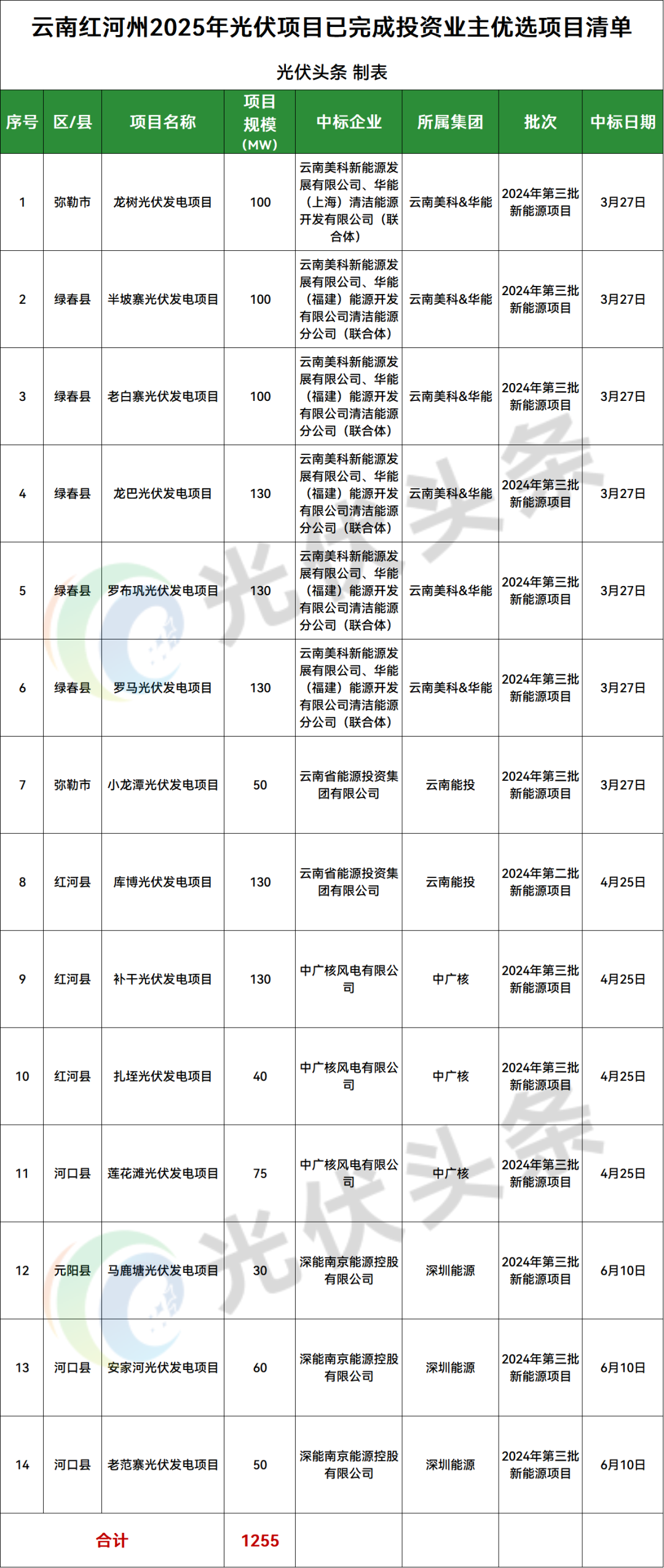 红河州绿春县、红河县、河口县、弥勒市、元阳县5地光伏项目竞配结果公示,规模共计1255MW;