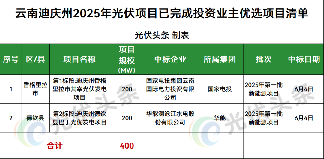 迪庆州香格里拉市、德钦县2地光伏项目竞配结果公示,规模共计400MW;