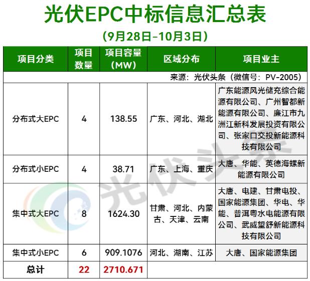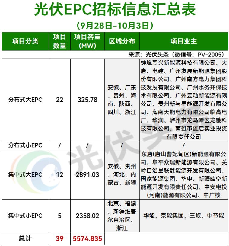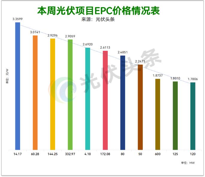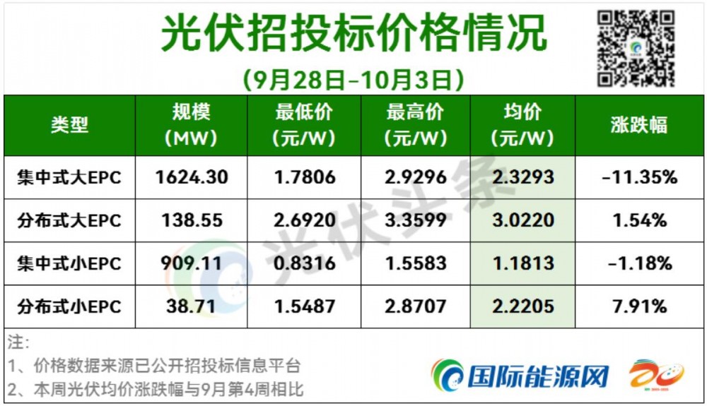光伏头条根据9月28日至10月3日光伏EPC市场情况,精选展示最高价以及最低价项目。