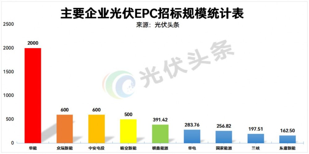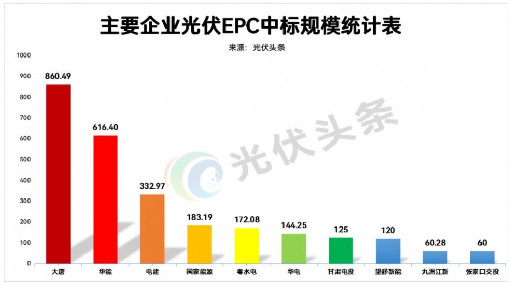 光伏头条根据公开信息统计,中标方面,大唐、华能、电建、国家能源集团、华电等企业发布了22个中标项目,总规模2710.67MW。其中,大唐集团以860.49MW排名第一,华能集团以616.4MW排名第二,中国电建以332.97MW位列第三。