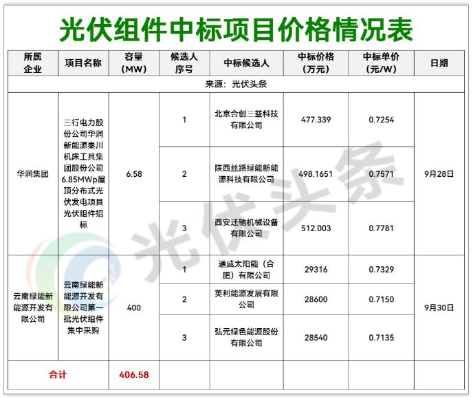 本周华润、云南绿能光伏组件项目明确中标价格。
