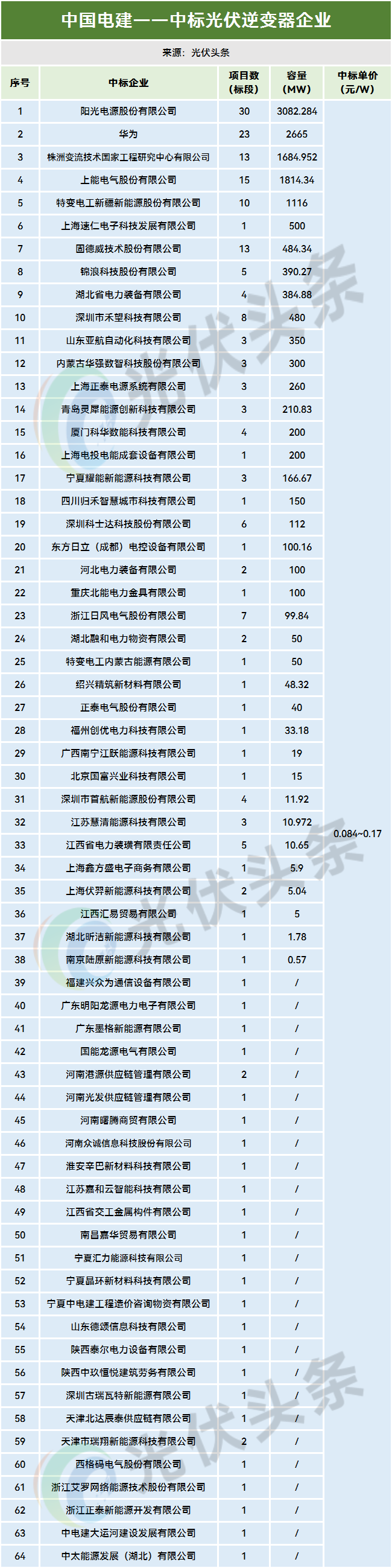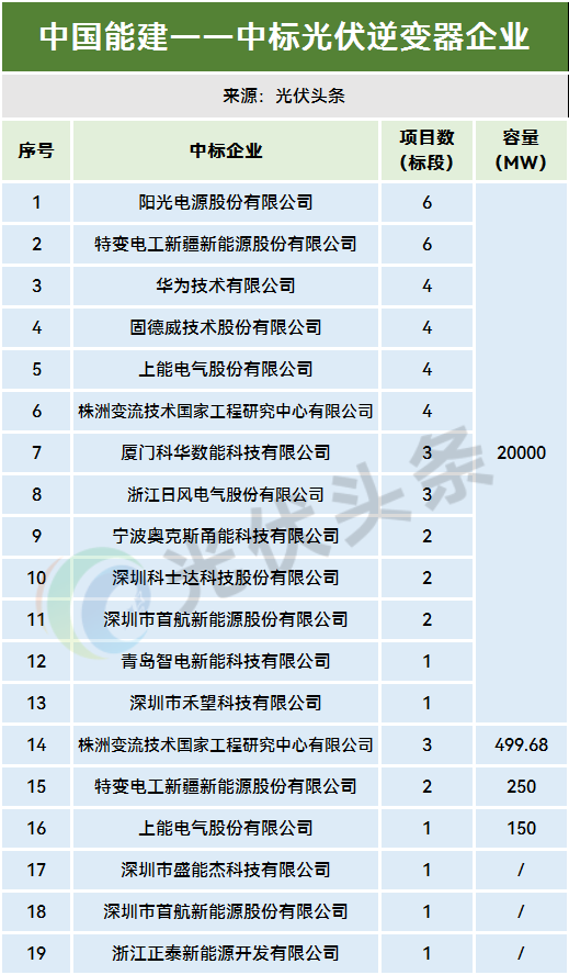 中国能建有15个项目定标,合计容量21.69GWMW。8月14日,中国能建20GW逆变器集采项目定标,阳光电源、特变电工、华为、固德威、上能电气、中车时代电气(株洲变流)、科华数能、科士达、首航新能、禾望电气等13家企业中选。