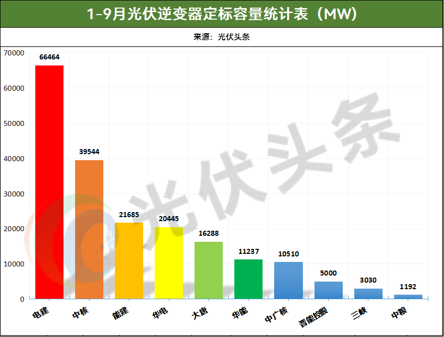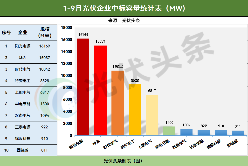 光伏头条根据公开信息统计,除去数个项目未公布企业实际中标规模外,已确定中标容量项目,阳光电源中标16169MW,排名榜首;华为中标15037MW,排名第二;中车时代电气(株洲变流)中标10842MW,排名第三。除此之外,特变电工(8528MW)、上能电气(6817MW)、山东华电节能技术有限公司(1500MW)、双杰电气(1094MW)、正泰电源(922MW)、锦浪科技(910MW)、固德威(811MW)也位列1-9月逆变器中标榜前十。