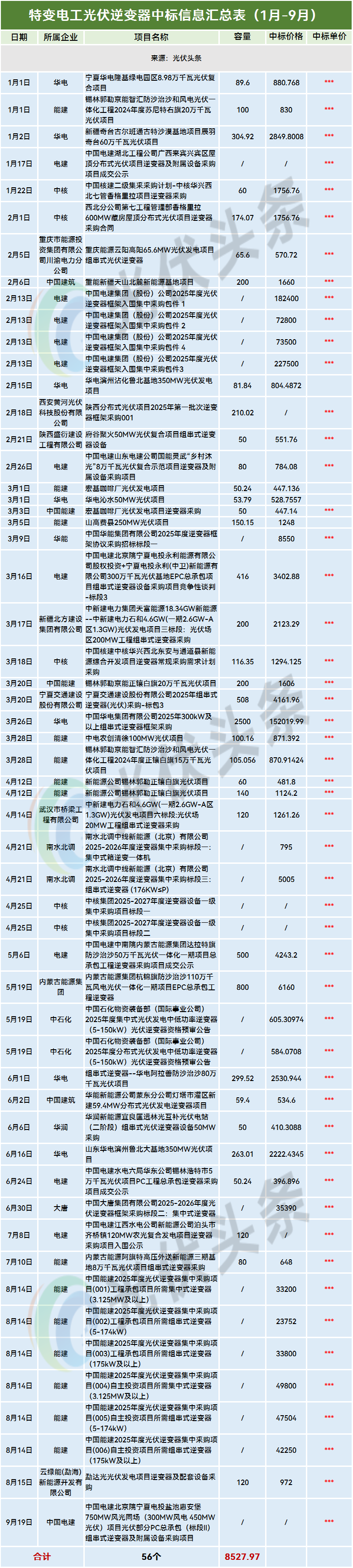 光伏头条根据公开信息统计,2025年1-9月,央国企约264个光伏逆变器招标项目,合计容量约71.57GW。