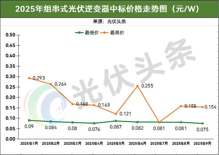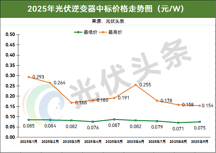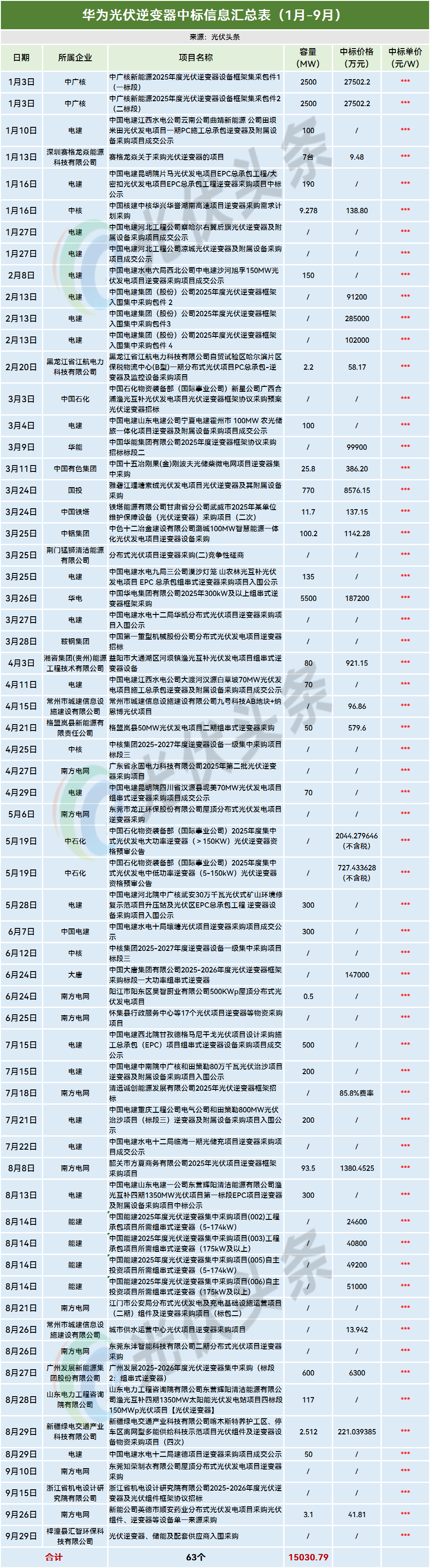 光伏头条根据公开信息统计,华为1-9月,光伏逆变器中标均价为0.125元/W。