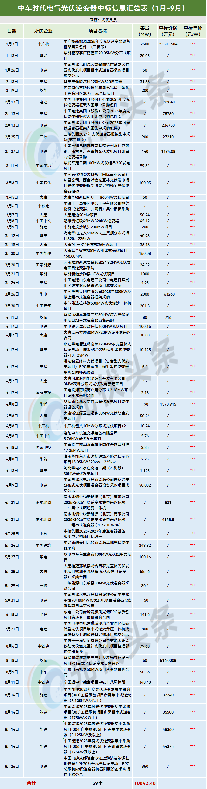 如需要获取详细项目数据表、以及中标单价,可订阅《能源行业报告 · 光伏(周报)》,立即订阅其中,光伏头条根据公开信息统计,中车时代电气(株洲变流)1-9月平均中标价格为0.105元/W。