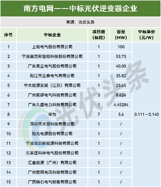 7、中标企业方面,阳光电源、华为、中车时代电气(株洲变流)、特变电工、上能电气、华电节能、双杰电气、正泰电源、锦浪科技、固德威等170家企业中标。