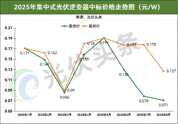 价格方面,光伏头条根据公开信息统计数据显示,本统计周期最低价定标项目为广州发展2025-2026年度光伏逆变器集中采购(标段1:集中式逆变器)。项目招标人为广州发展新能源集团股份有限公司,项目中标价0.071元/W。