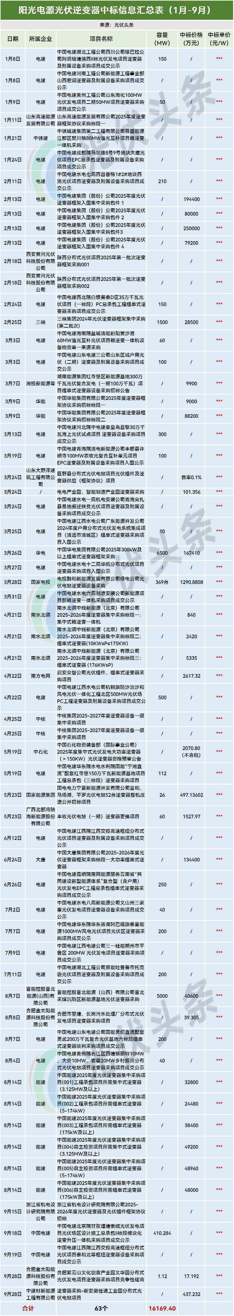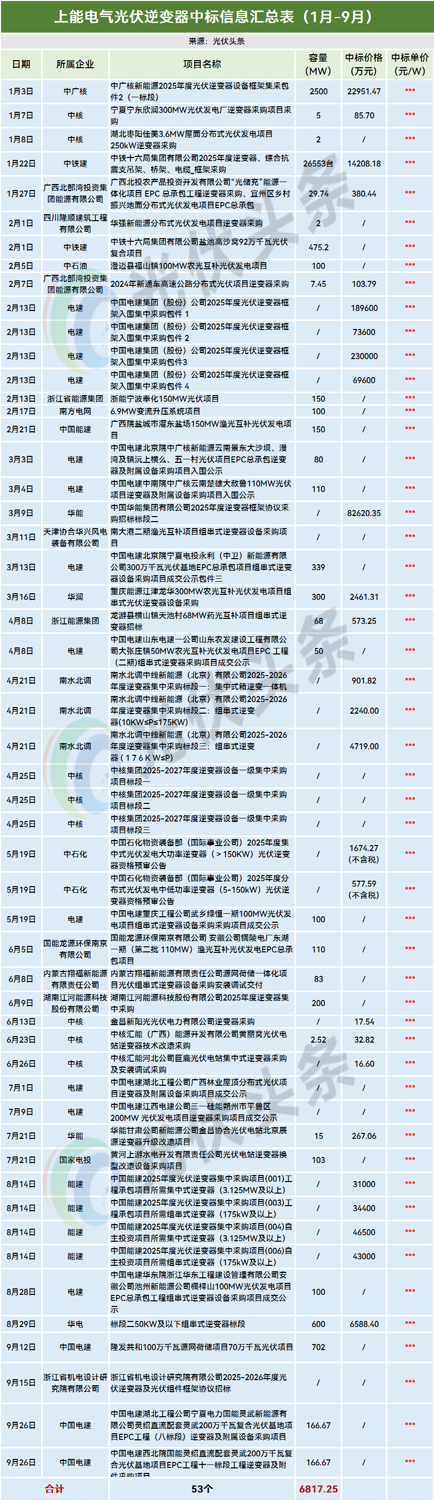 其中,除去框架集采未公布企业具体中标规模外,约有470个光伏逆变器招标项目(标段)定标,合计容量210.43GW。(注:包含2024年招标,最终在2025年定标的项目)1-9月份,央国企光伏逆变器招标、中标合计容量为282GW。