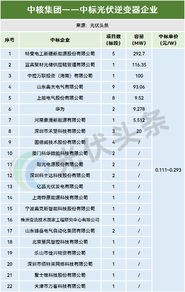 中核集团有39个项目定标,合计容量39.54GW。特变电工、上能电气、华为、禾望电气、固德威、科华数能、阳光电源、科士达、中车时代电气(株洲变流)等22家企业成为最大赢家。