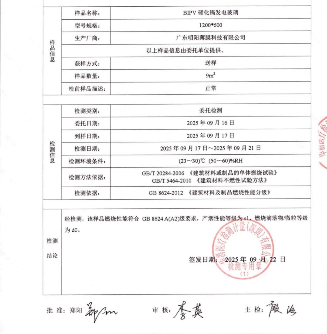 此项认证标志着我们的BIPV产品不仅是一款高效的发电材料,更是一块安全可靠的建筑外墙,为高端及高层建筑项目的绿色能源应用提供了坚实的安全保障。